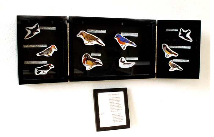 Triptych of North American birds impacted by starlings, digital prints, wood, glass